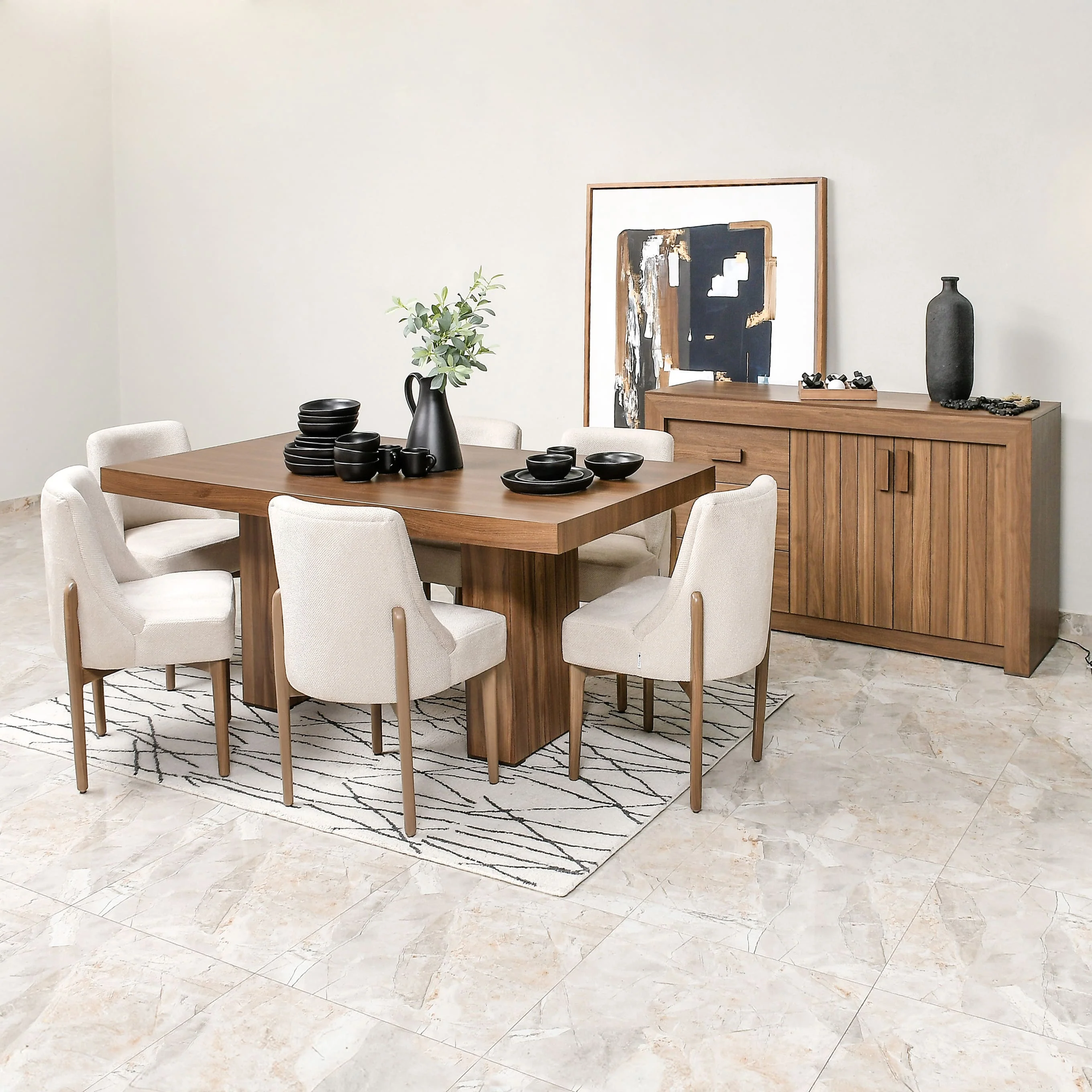 El Buffetero Marmore combina sofisticación y practicidad, convirtiéndose en el complemento perfecto para un comedor moderno. Elaborado en madera industrializada con un acabado en tono nogal, su estilo limpio y contemporáneo aporta calidez y elegancia al espacio. Cuenta con tres amplios cajones que facilitan el orden de cubiertos y mantelería, además de dos puertas abatibles que revelan estantes espaciosos para guardar vajillas, cristalería o destacar elementos decorativos. Una pieza funcional que realzará y organizará tu comedor con estilo.