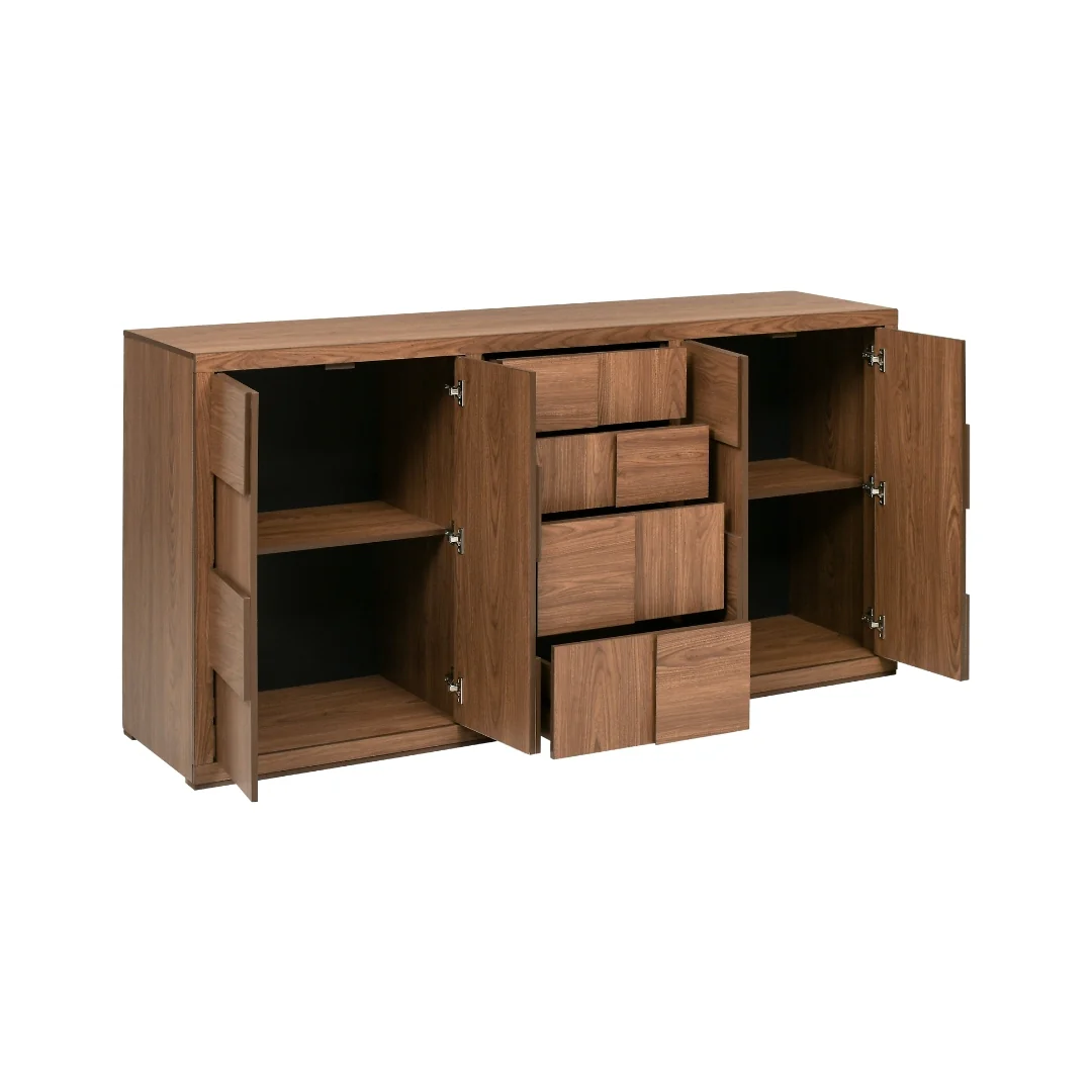 El Bufetero Nairobi Mel-Nogal destaca por su diseño moderno y funcional, que incorpora relieves decorativos en puertas y cajones para un estilo sofisticado. Hecho en melamina con acabado nogal, ofrece una combinación perfecta de elegancia y calidez. Con cuatro puertas equipadas con entrepaños internos y cinco cajones centrales, brinda un amplio espacio que facilita mantener tu área organizada y ordenada.