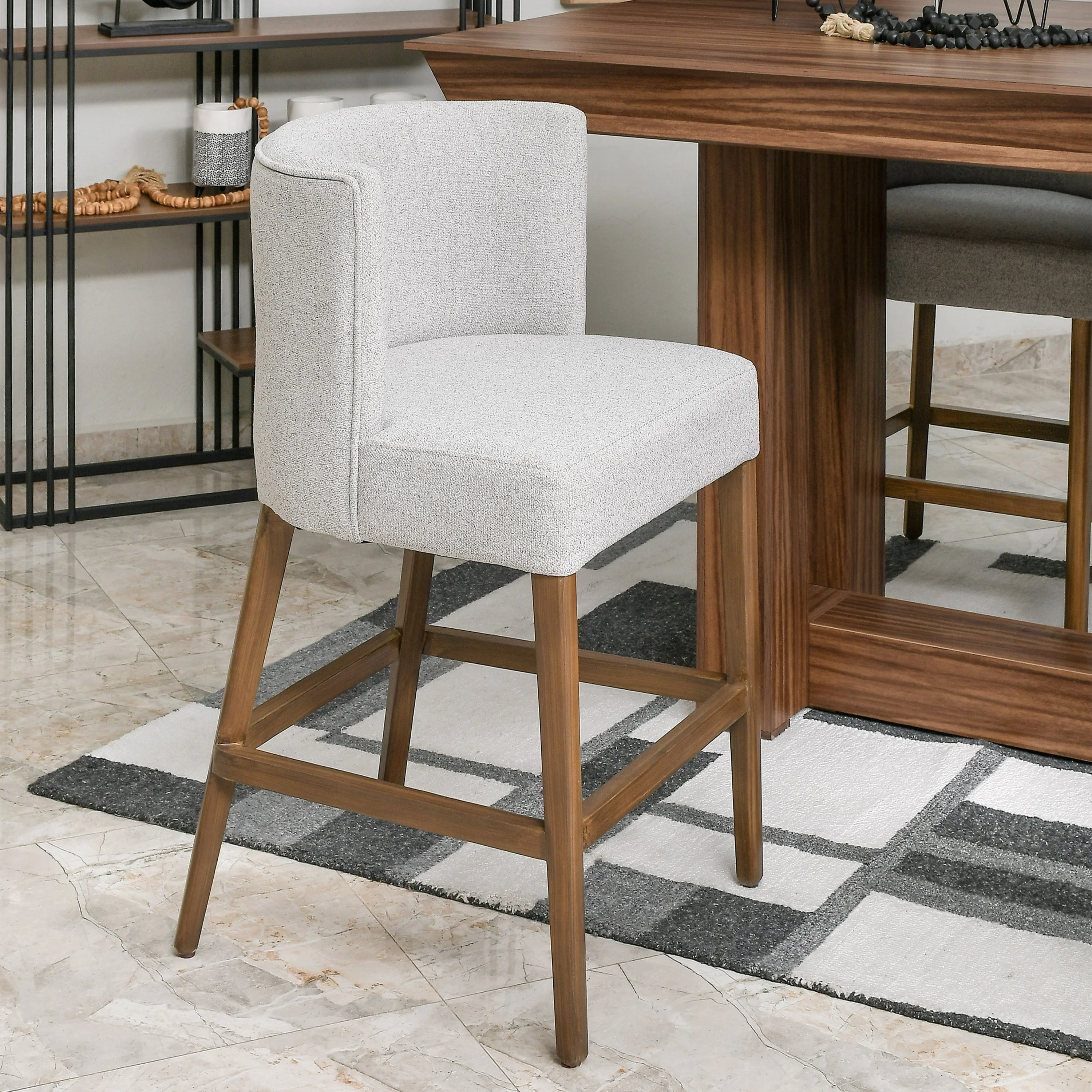 La Mesa Alta Alpina para 6 personas destaca por su diseño contemporáneo y su cálido acabado en nogal que aporta un toque natural al ambiente. Su estructura de madera de pino sólida y líneas geométricas ofrecen una presencia elegante sin sobrecargar el espacio. Incluye 6 Bancos Desayunador Barcelona, elaborado en madera de pino y tapizado con tela Dynamic Ash, que combina confort y estilo a la perfección. Con su altura tipo desayunador, transforma cualquier encuentro en una experiencia más cercana y relajada, ideal para hogares y establecimientos que buscan funcionalidad con estilo.