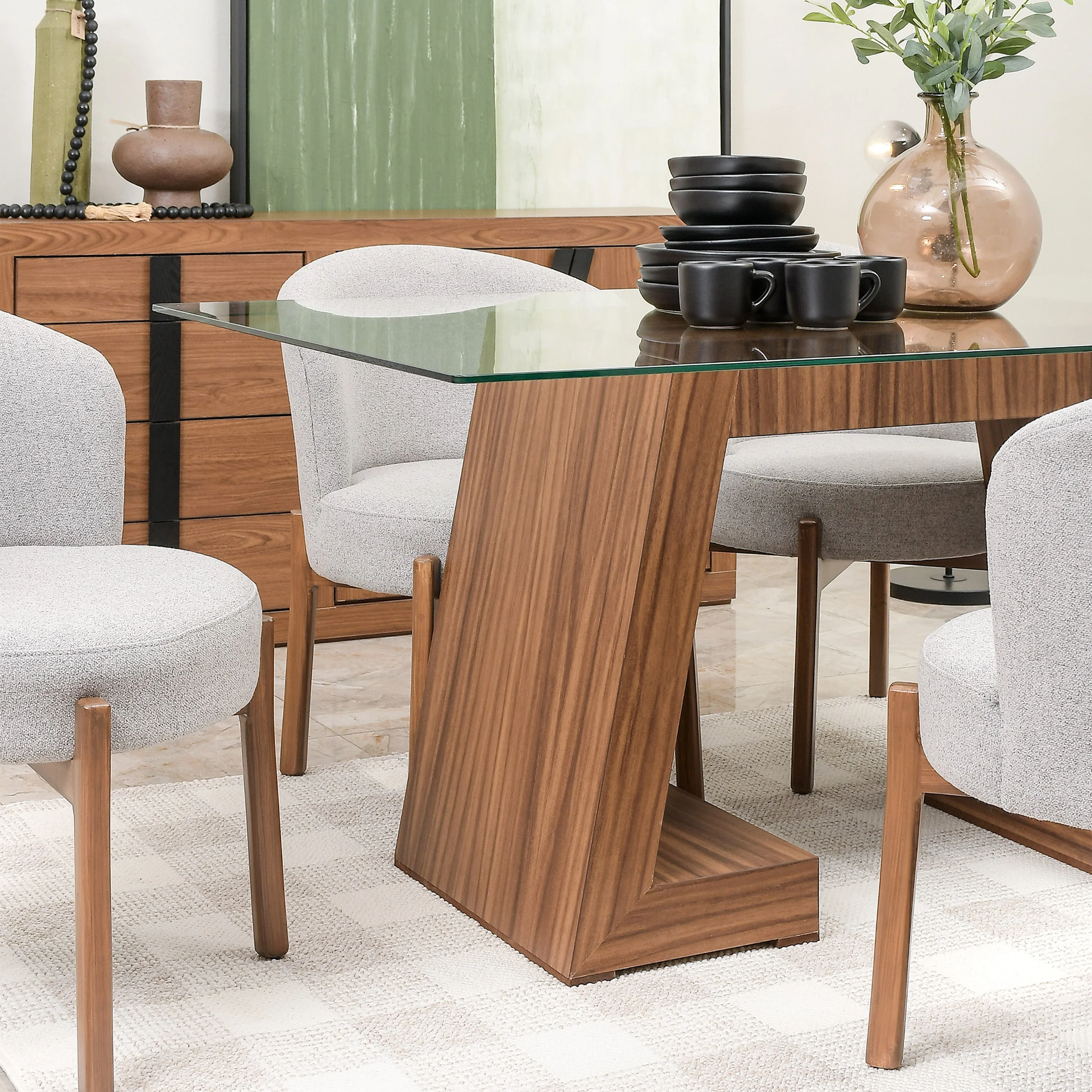 El Comedor Oasis para 6 personas es la opción perfecta para transformar tu espacio en un lugar de encuentro y elegancia. Su mesa destaca por su base de madera noble y cubierta de cristal templado, creando un contraste sofisticado que refleja modernidad y calidez. Las Sillas Portugal, tapizadas en la exclusiva tela Dynamic Ash, ofrecen una textura suave y envolvente que garantiza comodidad durante largas comidas en familia. Cada detalle ha sido cuidadosamente diseñado para crear un ambiente refinado donde la funcionalidad se encuentra con el buen gusto. Este conjunto es ideal para quienes buscan muebles que combinen durabilidad, confort y un diseño contemporáneo que perdure en el tiempo. Perfecto para cenas especiales, reuniones cotidianas o simplemente para disfrutar de momentos memorables alrededor de una mesa hermosa.