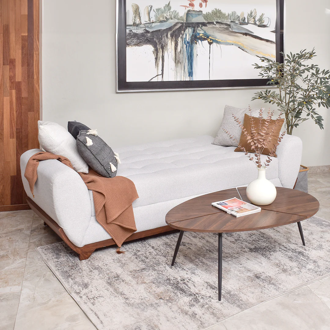 El Sofá Cama Boston es la opción perfecta para quienes desean un mueble que une elegancia y confort. Fabricado con estructura de madera de pino y tapizado en tejido 100% poliéster en un elegante tono Ithaca Platinum, garantiza durabilidad y estilo. La combinación de espuma de poliuretano y delcrón siliconizado ofrece un descanso cómodo y placentero. Su diseño minimalista y color neutro lo hacen adaptable a cualquier ambiente. Al desplegarse, se transforma en una cama amplia y confortable, ideal para recibir visitas sin sacrificar espacio ni estética en el hogar.
